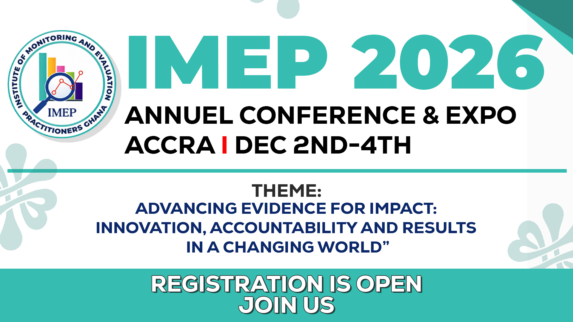 The Institute of Monitoring and Evaluation Practitioners (IMEP) invites you to its Annual Conference and Expo, taking place in Accra, Ghana, from 2–4 December 2026.